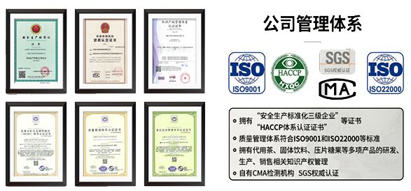 10W级GMP净化车间,拥有亳州唯一的CMA中国计量认证实验室,有第三方检测资质严格的质量管理体系:ISO质量管理体系/HACCP体系认证